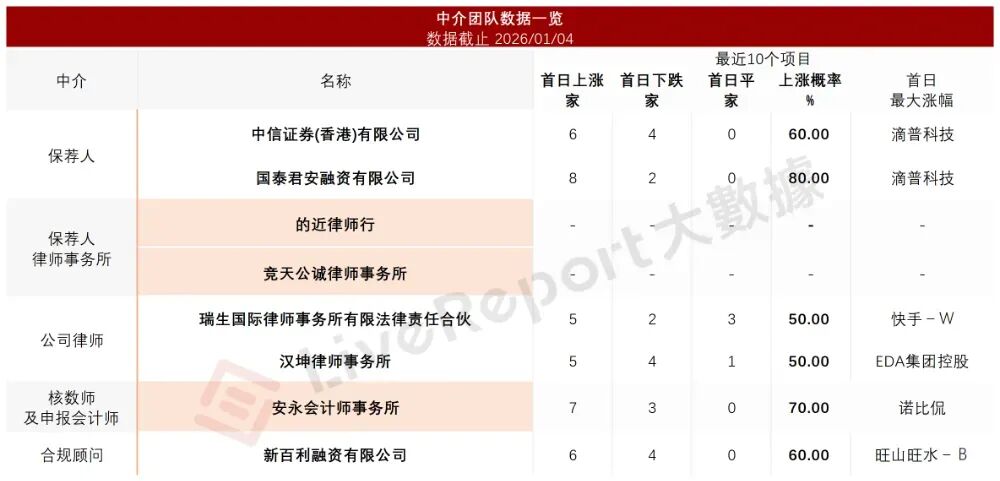 據LiveReport大數據統計,斯坦德機器人中介團隊共計8家,其中保薦人2家,近10家保薦項目數據表現尚可;公司律師共計2家,綜合項目數據表現平平。整體而言中介團隊歷史數據表現一般。