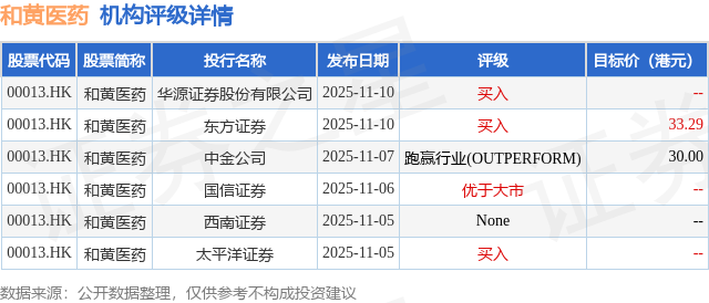 投行對該股的評級以買入為主,近90天內共有3家投行給出買入評級,近90天的目標均價為31.64港元。華源證券股份有限公司最新一份研報給予和黃醫藥買入評級。