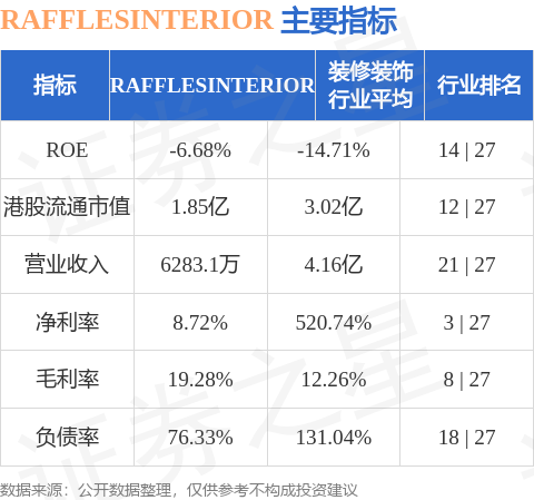 RAFFLESINTERIOR港股市值1.85億港元,在裝修裝飾行業中排名第12。主要指標見下表: