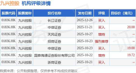 投行對該股的評級以買入為主,近90天內共有4家投行給出買入評級,近90天的目標均價為19.57港元。長江證券最新一份研報給予九興控股買入評級。