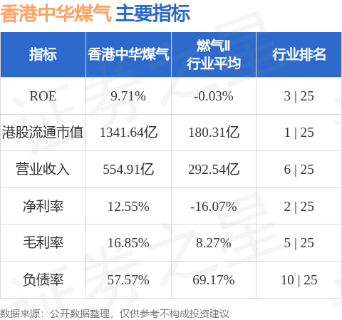 香港中華煤氣港股市值1341.64億港元,在燃氣Ⅱ行業中排名第1。主要指標見下表: