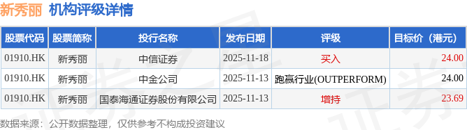 投行對該股的評級以跑贏行業(OUTPERFORM)為主,近90天內共有1家投行給出跑贏行業(OUTPERFORM)評級,近90天的目標均價為23.9港元。中信證券最新一份研報給予新秀麗買入評級,目標價24港元。