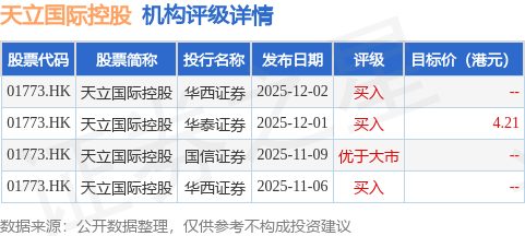 截至2026年1月22日收盤,天立國際控股(01773.HK)報收於2.67港元,下跌1.48%,成交量1216.4萬股,成交額3223.2萬港元。投行對該股的評級以買入為主,近90天內共有3家投行給出買入評級,近90天的目標均價為4.21港元。華西證券最新一份研報給予天立國際控股買入評級。