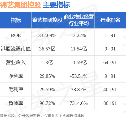 錦藝集團控股港股市值36.57億港元,在商業物業經營行業中排名第9。主要指標見下表: