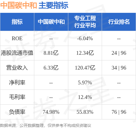 中國碳中和港股市值8.81億港元,在專業工程行業中排名第24。主要指標見下表: