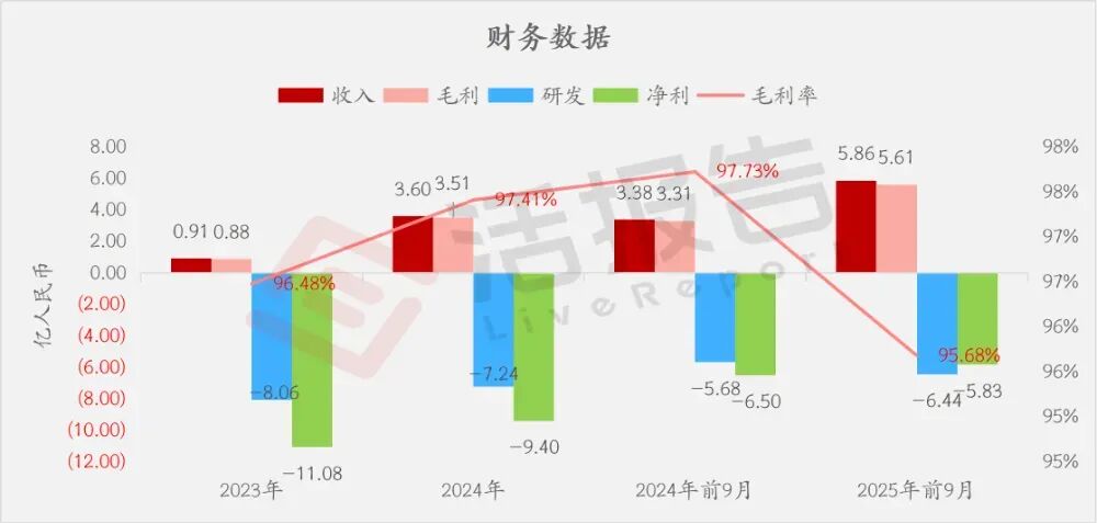 毛利率95.68%。2025年前9月公司虧損收窄。