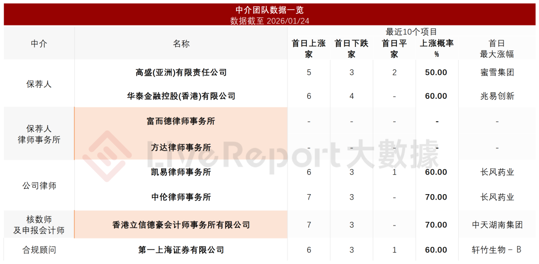 據LiveReport大數據統計,迪哲醫藥中介團隊共計8家,其中保薦人2家,近10家保薦項目數據表現有待提升;公司律師共計2家,綜合項目數據表現普通。整體而言中介團隊歷史數據表現中規中矩。