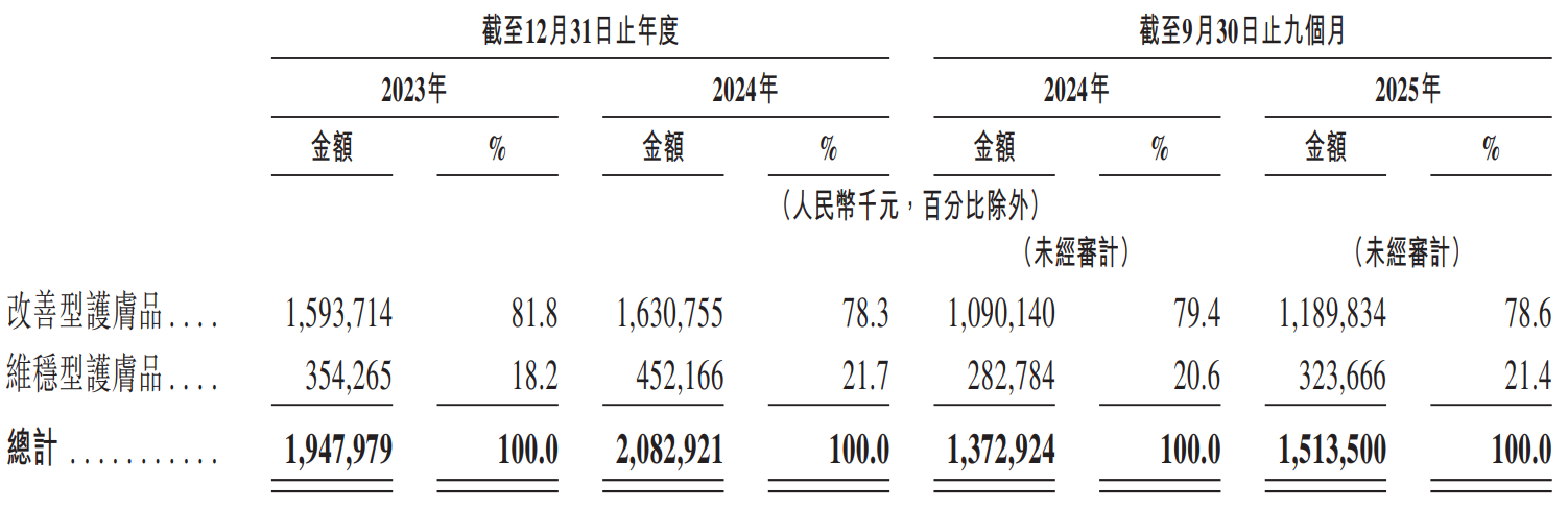 公司收入主要來自護膚品銷售,重大部分來自改善型護膚品,2024年佔總營收的78.3%,核心包括A醇成分護膚品、α-熊果苷煥顏精萃水等明星產品;維穩型護膚品佔比21.7%,為重要補充。