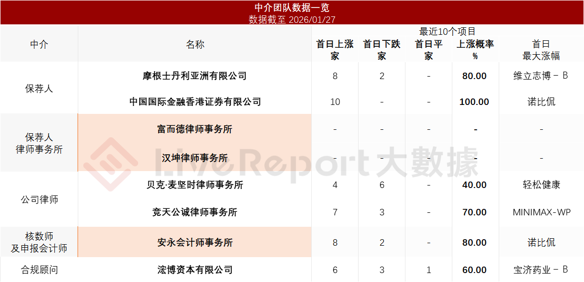 據LiveReport大數據統計,護家科技中介團隊共計8家,其中保薦人2家,近10家保薦項目數據表現優異;公司律師共計2家,綜合項目數據表現有待提升。整體而言中介團隊歷史數據表現尚可。