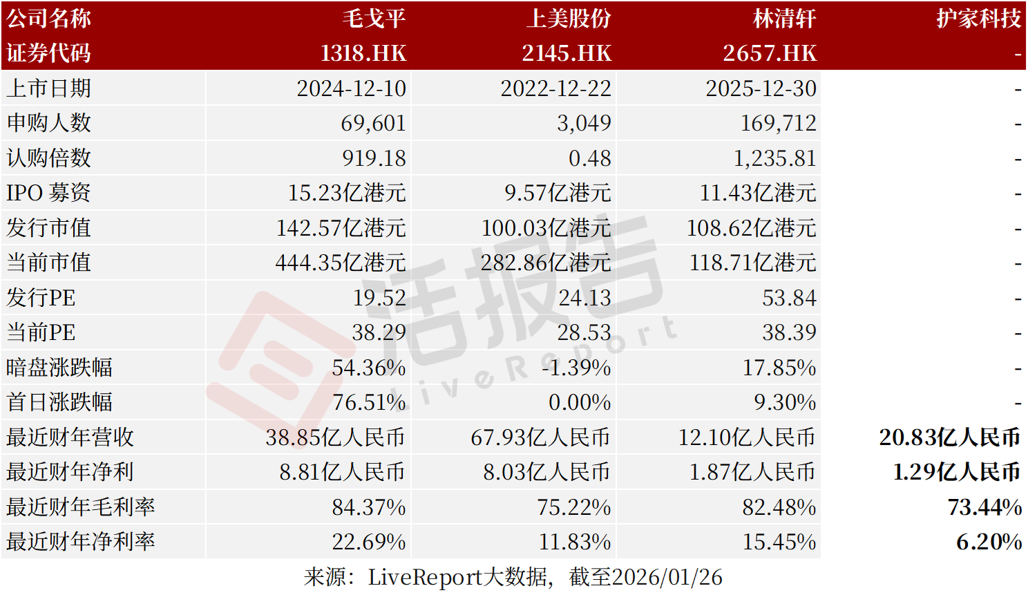 毛戈平(1318.HK)、上美股份(2145.HK)、林清軒(2657.HK)