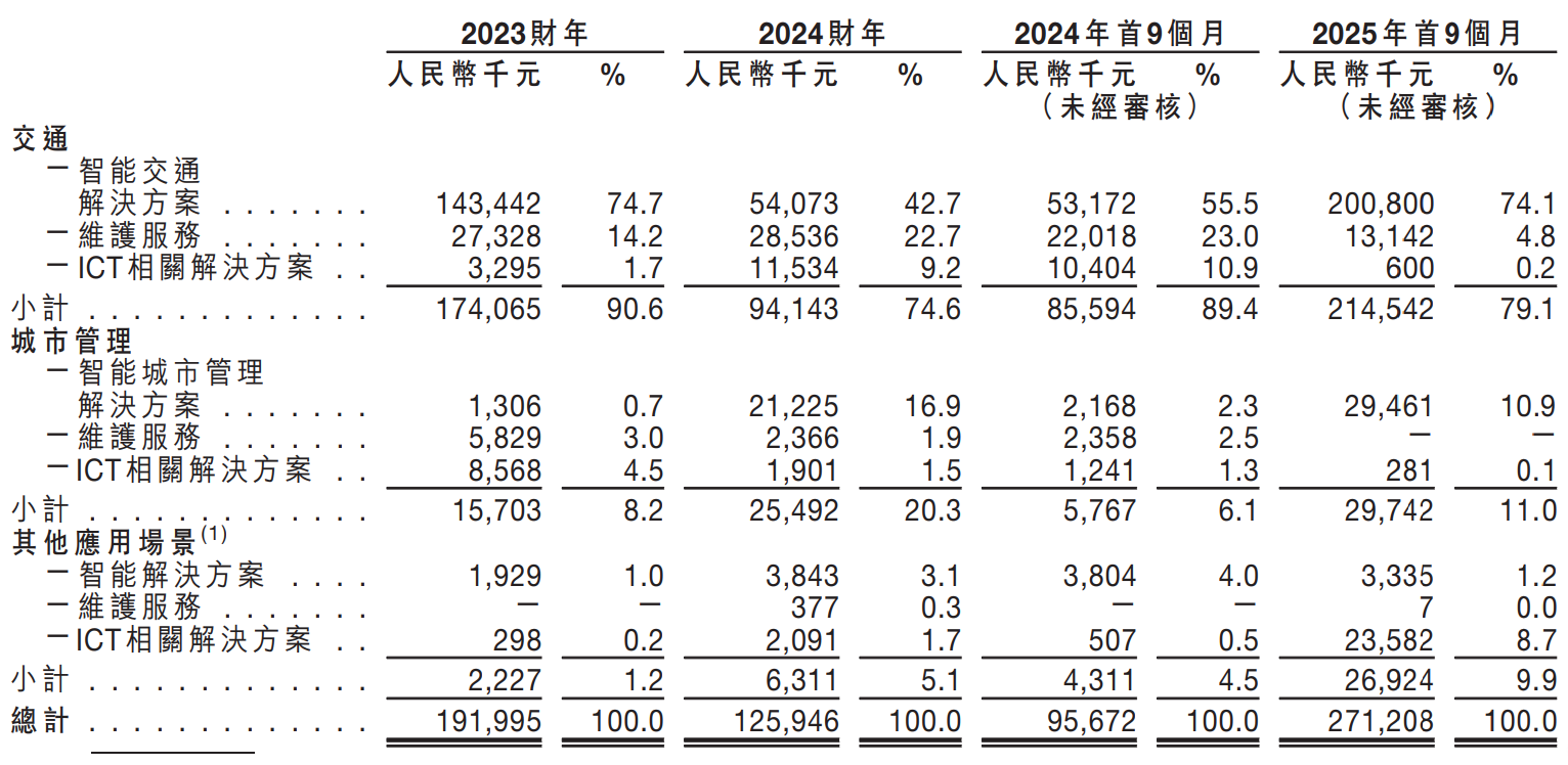 公司的收入高度集中於交通業務,該業務在2023財年和2024財年分別佔總收入的90.6%和74.6%,其中智能交通解決方案是核心貢獻來源。城市管理業務收入佔比相對較小,分別為8.2%和20.3%