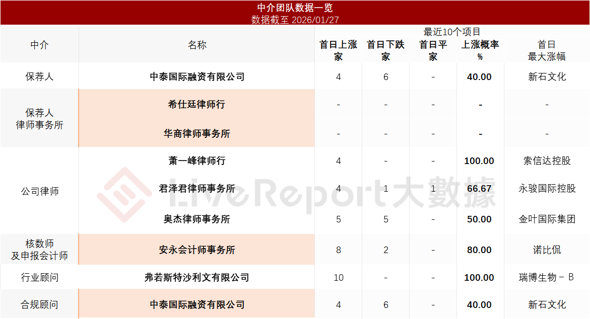 據LiveReport大數據統計,拓必達中介團隊共計9家,其中保薦人1家,近10家保薦項目數據表現差強人意;公司律師共計3家,綜合項目數據表現中規中矩。整體而言中介團隊歷史數據表現普通。