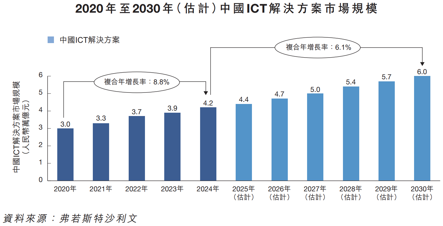 中國ICT解決方案市場保持強勁增長。市場規模由2020年約人民幣3.0萬億元擴大至2024年人民幣4.2萬億元,複合年增長率約為8.8%,預計至2030年將進一步增長至約人民幣6.0萬億元,複合年增長率約為6.1%。