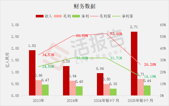 ,淨利潤0.40億元,毛利率50.58%;2025年前9個月收入2.71億元,同比增長183.48%,淨利潤0.44億元,同比增長