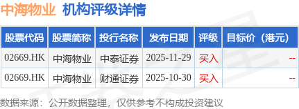 投行對該股的評級以買入為主,近90天內共有2家投行給出買入評級。中泰證券最新一份研報給予中海物業買入評級。