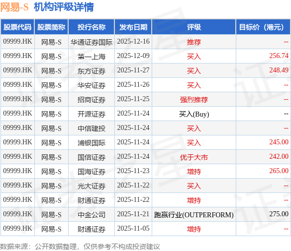 投行對該股的評級以買入為主,近90天內共有6家投行給出買入評級,近90天的目標均價為255.37港元。華通證券國際最新一份研報給予網易-S推薦評級。
