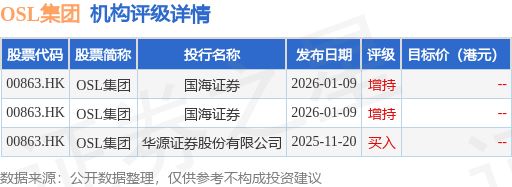 截至2026年2月4日收盤,OSL集團(00863.HK)報收於15.14港元,下跌0.39%,成交量534.53萬股,成交額8119.85萬港元。投行對該股的評級以增持為主,近90天內共有2家投行給出增持評級。國海證券最新一份研報給予OSL集團增持評級。