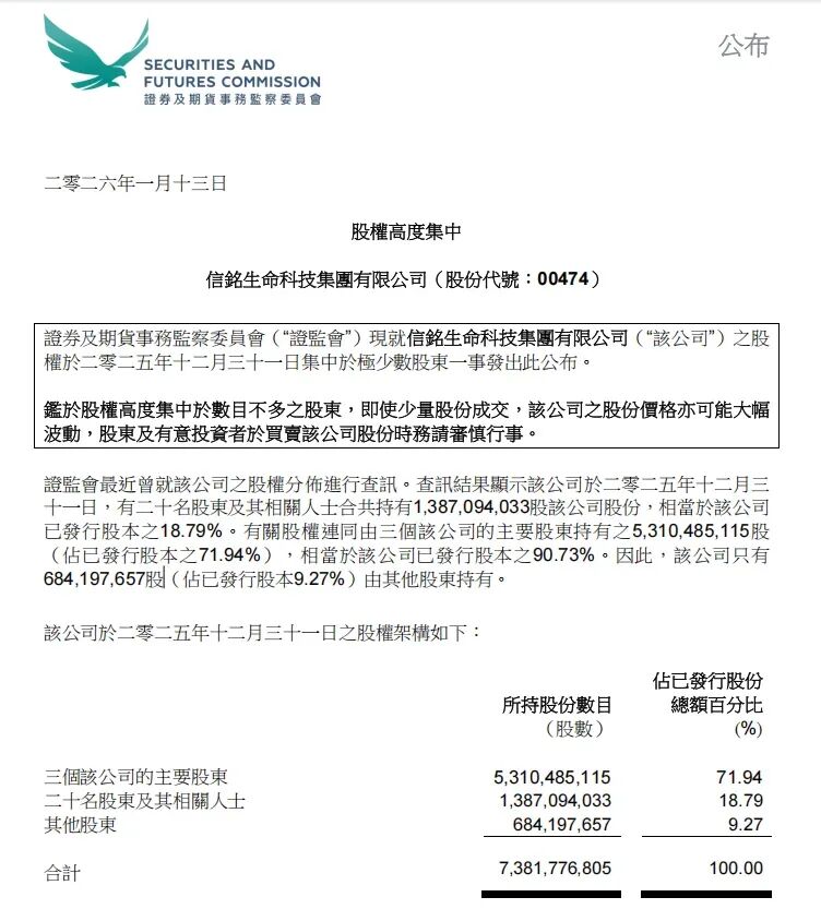 日,證監會公佈,最近曾就信銘生命科技(股份代號:00474)之股權分佈進行查訊。查訊結果顯示,現時該公司只有約6.84
