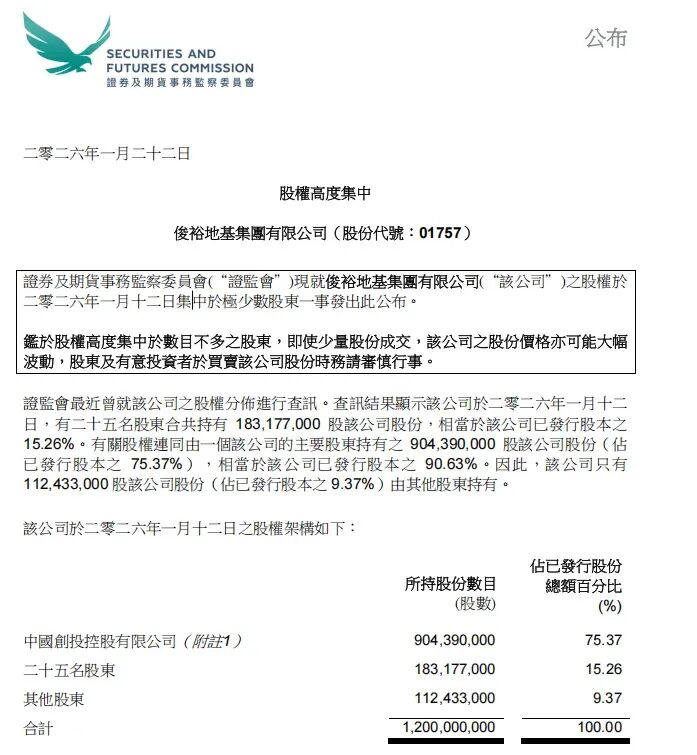 1月22日,證監會公佈,最近曾就俊裕地基(01757.HK)之股權分佈進行查訊。查訊結果顯示,現時該公司只有約1.124