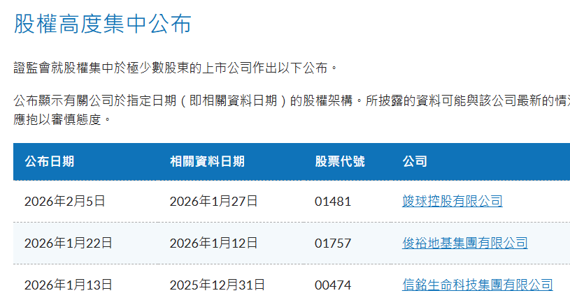 2026年2月5日,證監會公佈,最近曾就竣球控股(01481.HK)之股權分佈進行查訊。查訊結果顯示,現時該公司只有約935.4萬股(佔已發行股本約9.17%的股份),由其他股東持有,大部分的股份由少數股東集中持有。
