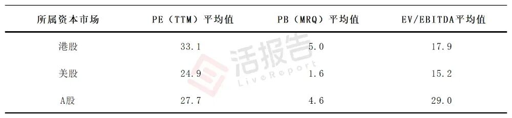 A股PE(TTM)平均值27.7倍、PB(MRQ)平均值4.6倍、EV/EBITDA平均值29.0倍。
