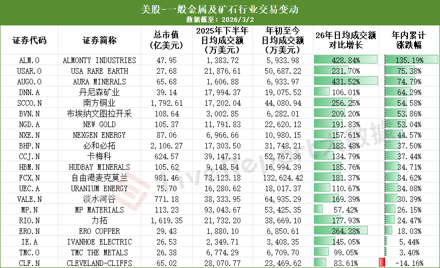 此外,稀土標的也在崛起,USA RARE EARTH(USAR.O)年內大漲75.38%,年內日均成交額暴增231.7%。在美中博弈加劇的背景下,北美試圖構建本土稀土供應鏈的每一個動作都被資本放大。