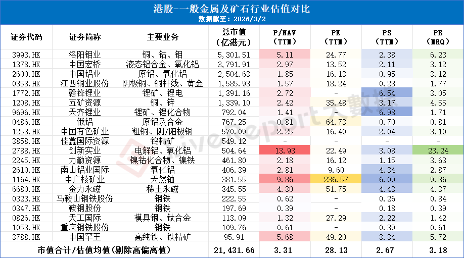 港股估值均值分別為:P/NAV 3.31倍,PE 28.13倍,PS 2.67倍,PB 3.18倍。估值水平對比其他兩個市場相對温和,既反映了國際投資者對當前港股周期品種的審慎,也體現了一批行業龍頭(如洛陽鉬業、中國宏橋)在上行周期前常年處於超低估值。