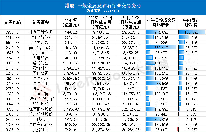 港股市場中,除了洛陽鉬業、中國宏橋等龍頭保持穩健外,「小而美」的戰略標的大放異彩。其中,主營鎢精礦的佳鑫國際資源(3858.HK)2026年初至今日均成交額較2025下半年激增274.68%,年內累計漲幅高達158.03%;主營天然鈾的中廣核礦業(1164.HK)成交額增長145.74%,漲幅達62.46%。這背后是鎢被定位為「高端製造的脊樑」,供給持續收緊;而鈾作為核電和能源獨立的戰略資源,其價值被全球重新認識。