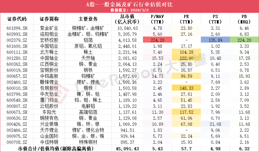 A股估值均值分別為:P/NAV 5.43倍,PE 57.7倍,PS 4.98倍,PB 6.32倍。尤其是PE和PB的大幅抬升,顯示出國內資本市場對戰略性資源品種給予了顯着的 「稀缺性溢價」和 「流動性溢價」 。然而,與港股趨同的是,傳統鋼鐵板塊在A股同樣處於相對低估值狀態(如寶鋼股份P/NAV僅0.71倍),表明資金對行業周期的判斷高度一致。