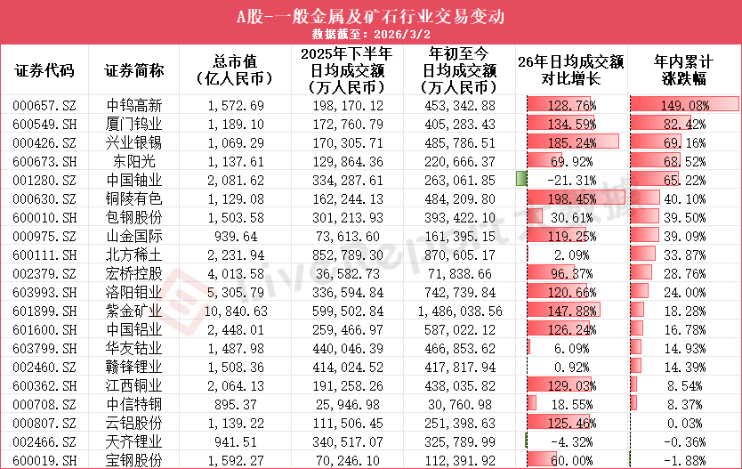A股市場漲幅居前的同樣是具備戰略屬性的資源品種。其中中鎢高新(000657.SZ)年內漲149.08%,廈門鎢業(600549.SH)漲82.42%,興業銀錫(000426.SZ)漲69.16%;年內日均成交額增長分別為128.76%、134.59%,185.24%。
