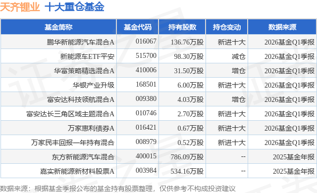 根據2026基金Q1季報公募基金重倉股數據,重倉該股的公募基金共8家,其中持有數量最多的公募基金為鵬華基金的鵬華新能源汽車混合A。鵬華新能源汽車混合A目前規模為15.41億元,最新淨值1.383(4月20日),較上一交易日下跌0.84%,近一年上漲79.77%。該公募基金現任基金經理為閆思倩。閆思倩在任的基金產品包括:鵬華滬深港新興成長混合A,管理時間為2022年5月7日至今,期間收益率為38.87%;鵬華碳中和主題混合A,管理時間為2023年5月5日至今,期間收益率為84.7%;鵬華科技驅動混合發起式A,管理時間為2024年8月29日至今,期間收益率為24.42%。