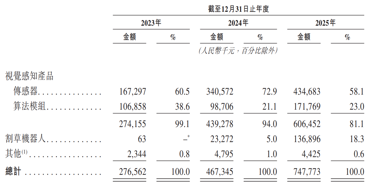 公司收入主要來自視覺感知產品與智能割草機器人,其中傳感器、算法模組等視覺感知產品為收入最重大來源,佔比超