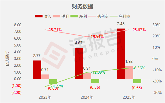%,淨虧損0.56億元,毛利率19.54%;2025年收入7.48億元,同比增長60.00%,淨虧損0.63億元,毛利率25.67%。