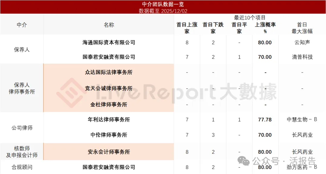 據LiveReport大數據統計,樂動機器人中介團隊共計9家,其中保薦人2家,近10家保薦項目數據表現尚可;公司律師共計2家,綜合項目數據表現穩妥。整體而言中介團隊歷史數據表現較好。