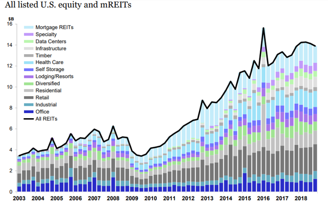 Nothing is guaranteed in the stock market, and during the recession, total dividends paid by REITs on a trailing 12-month basis dropped from a peak of $22.3 billion in Q2 of 2017 to $14.4 billion in, a drop of approximately 35% in Q4 of 2009. By Q4 of 2011, the trailing 12-month dividends exceeded the pre-recession highs.