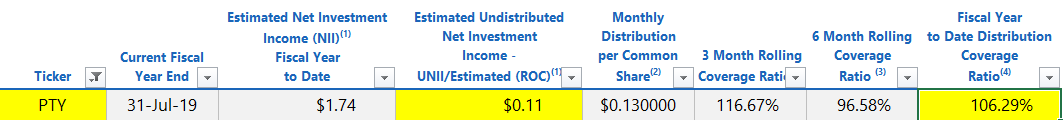 One of the most positive attributes going for PTY right now is the fund's income production metrics. This was an area of concern for me during my last review, as the fund's UNII balance was quite small, and the distribution coverage ratios were relatively weak. I noted that while PTY's distribution was not at risk, these were metrics to monitor going forward.
