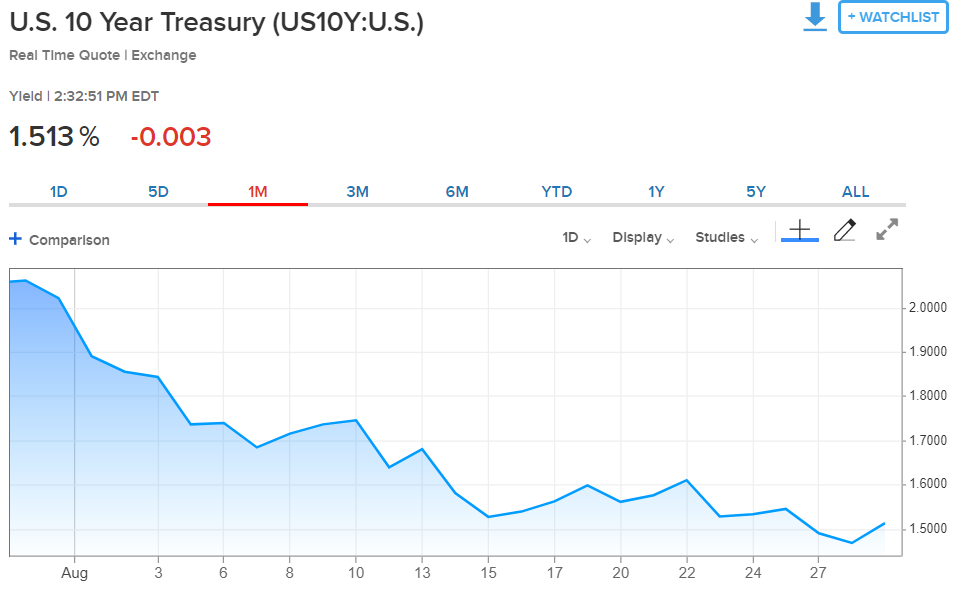 One, investors appear to be reacting in a fairly straight forward manner when it comes to fixed-income exposure. When there is trade-induced volatility, investors are hiding out in government treasuries, which explains the dramatic drop in the yield of 10-year treasuries through August, shown below: