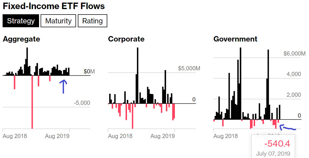 However, when we look back a few weeks prior, investor sentiment is markedly different. What was the reason for the divergence? The Fed's expected move on interest rates. Leading up to the July rate cut, investors had been pulling money consistently out of government bond ETFs, and in to other types of fixed-income products. One big winner was mortgage-debt. (The outflows/inflows for various sectors is shown below):