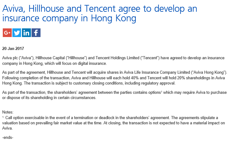 英傑華1月20日在官網披露,已經與高瓴資本、騰訊達成協議。英傑華集團(AVIVA)、高瓴資本和騰訊已同意在香港發展一家保險公司,專注數字保險服務。高瓴資本曾與百度共同發起百安保險,騰訊此前也已經參與設立了眾安保險和和泰人壽。
