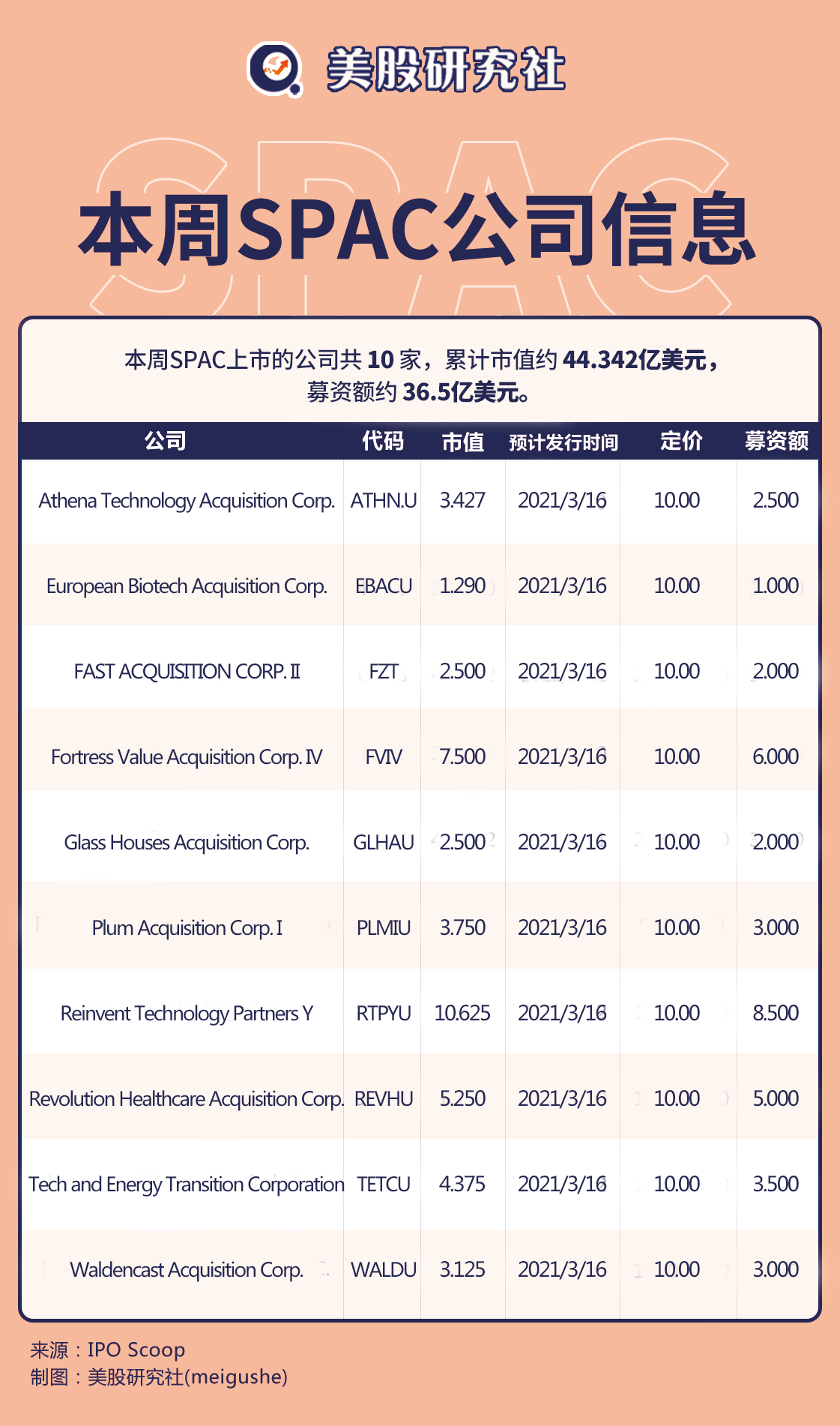 美股IPO市場將迎來10家SPAC公司上市,它們分別是:Athena Technology Acquisition Corp.、European Biotech Acquisition Corp.、FAST ACQUISITION CORP. II、Fortress Value Acquisition Corp. IV、Glass Houses Acquisition Corp.、Plum Acquisition Corp. I、Reinvent Technology Partners Y、Revolution Healthcare Acquisition Corp.、Tech and Energy Transition Corporation、Waldencast Acquisition Corp.