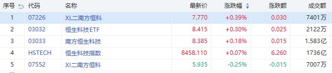 今日恆生科技指數漲0.07%。其中,南方兩倍做多恆科(07226.HK)漲0.39%,成交額7401萬港元;南方兩倍做空恆科跌0.25%,成交額7007萬港元。