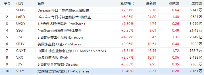 周一美股走低,納指跌近1%,區塊鏈概念股集體大跌,大型芯片股全線下挫。從ETF漲幅榜來看,隔夜空頭大獲全勝。半導體每日三倍做空(SOXS)大漲7.51%,漲幅居首,成交9147萬美元;1.5倍做多恐慌指數(UVXY)收漲5.8%,成交3.959億美元;三倍做空美國小盤股(TZA)漲逾4%,成交2.749億美元。