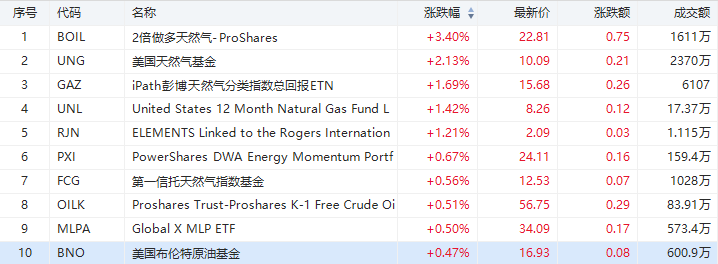 隔夜,清潔能源ETF繼續走高。其中,兩倍做多天然氣(BOIL)收漲3.4%,成交額達1611萬美元,上一周該ETF大漲11.75%,位居當周漲幅榜首位。
