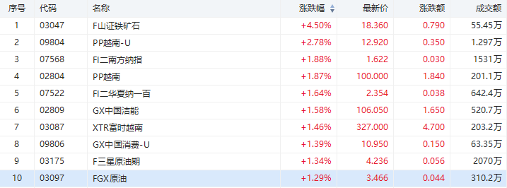 受消息影響,今日港股漲幅居前的有南方兩倍看空納指(07568.HK),收漲1.88%,成交1531萬港元。此外,受益於鐵礦石價格大漲創歷史新高,F山證鐵礦石ETF(03047.HK)今日大漲4.5%,位列漲幅榜首位,成交55.45萬港元。