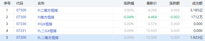 受震盪市影響,恆指相關ETF收盤漲跌幅變動不大。其中,南方二倍看空恆指(07500.HK)收平,全天成交額為3.185億港元;南方二倍看多恆指(07200.HK)成交額為1.923億港元。