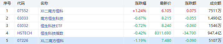 今日恆生科技指數小幅下挫0.42%。其中,兩倍南方做空恆科(07552.HK)收漲1.24%,成交額7511萬港元;南方恆生科技(03033.HK)收跌0.67%,成交額1.49億港元。