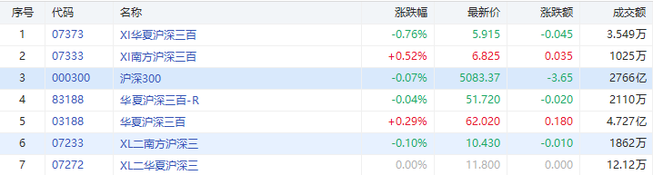 滬深300指數微跌0.07%。其中,華夏滬深三百(03188.HK)收漲0.29%,成交量4.727億港元;華夏滬深三百-R(83188.HK)小幅下跌0.04%,成交額2110萬港元。
