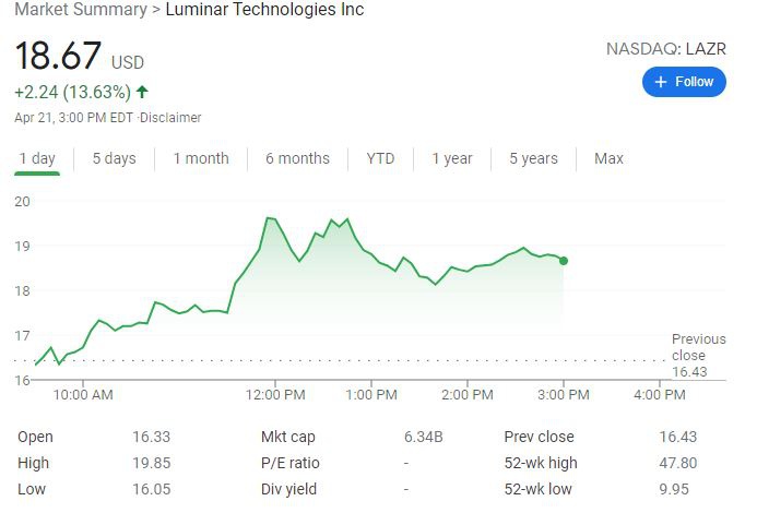 4月21日周三,由於從特斯拉(TSLA.US)和英特爾(INTC.US)分別挖角到高管,美國激光雷達公司Luminar Technologies(LAZR.US)股價盤中最高漲20.8%,美股尾盤保持超13%的漲幅,至4月14日以來的一周高位。特斯拉止跌轉漲近3%。
