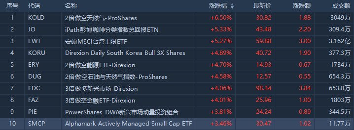 從ETF漲幅榜來看,居首位的是二倍做空天然氣的ProShares(KOLD)漲6.5%,成交額3049萬美元;其次,iPath彭博咖啡分類指數總回報ETN(JO),漲5.33%。