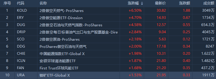 周二,做空能源類ETF表現強勢,其中二倍做空天然氣的ProShares(KOLD)漲6.5%,成交額3049萬美元;二倍做空能源ETF-Direxion(ERY)漲4.7%,成交額達1734萬美元。